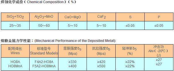 用途: 配用不同的焊丝(如H08A,H08MnA,H08MnMoA,H10MnSi),可焊接低碳钢,低合金钢及压力容器用钢,适应较快速度薄板的焊接,如煤气钢瓶、锅炉厂膜式水冷壁等部位的焊接。
