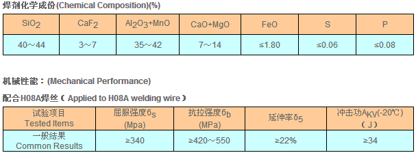 用途: 配合H08A,H08MnA,H10MnSi等焊丝,焊接低碳钢及某些低合金钢(如16Mn,15Mnv)结构,可用于焊接船舶、锅炉、低压容器等,也可以用于电渣焊及铜的焊接。